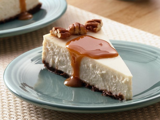 - Cover & refrigerate at least 3 hours. Drizzle caramel topping over cheesecake and garnish w/pecan halves.