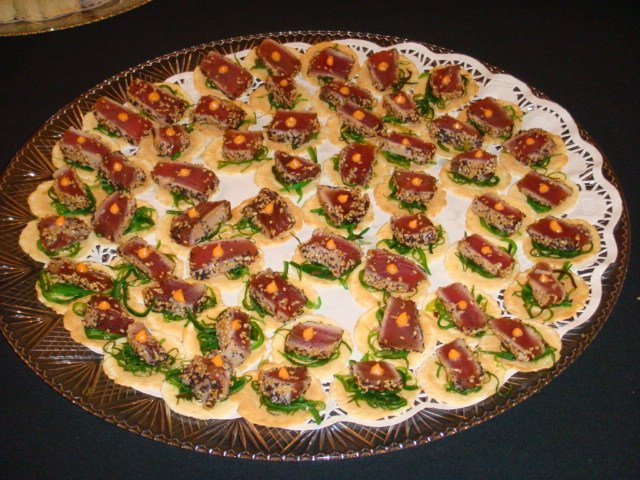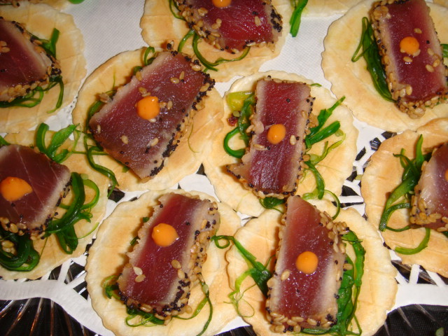 To make a nice seared tuna appetizer, prepare as above. Tuna can be placed on a cracker or wonton crisp, with a pinch of seaweed salad in between. To give it a little kick , you can place a drop of Japanese mayo on top of the tuna.