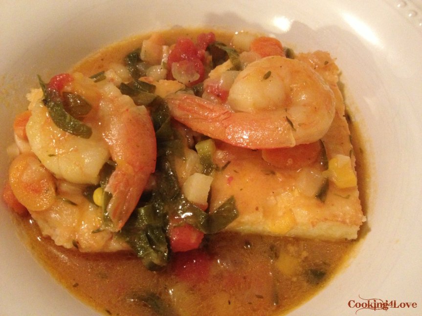 As you may, or may not know, I looooooooove shrimp and grits! While my earlier recipe on here is one of my all-time favorites, this one is simply delicious. I was watching The Chew on Friday, and Carla Hall made a dish called “Swamp Thing”, which was her healthier version of shrimp and grits. Once I saw it was loaded with vegetables, I was sold, and knew I had to try it, which I did later that day with a few small modifications. This recipe does take a little effort, as the grits need to be made about an hour beforehand, and there’s a decent amount of veggie chopping, but trust me when I say, it’s worth it! Thanks Carla!!!