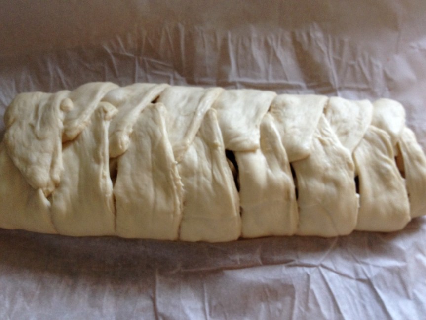9. Begin braid by folding top and bottom strips toward filling. Then braid strips left over right, right over left. Finish by pulling last strip over and tucking under braid.