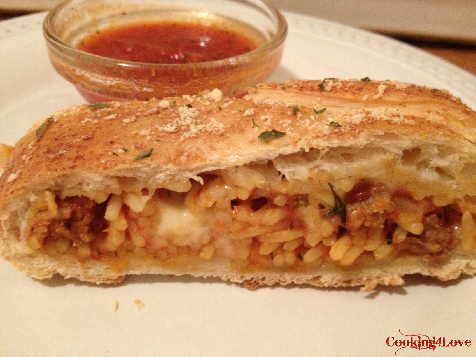 I loooooove bread and pasta, however, I try to keep my carb intake to a reasonable level. But, when I saw a picture of this recipe on Pinterest, I knew I had to try it. The original recipe calls for using frozen bread loaf dough, which I found to be a little difficult (aka sticky) to work with, so alternatively, you could use Pillsbury Crescent Dough Sheets to make it easier and much quicker (and cut down on the carbs a bit). With that being said, after I got the dough loaf thawed (which takes about 2 hours) and rolled out, everything else was a breeze. The end result was a delicious garlic bread filled with spaghetti and mozzarella cheese! So if you’re a carb-lover, you will truly enjoy this recipe.
