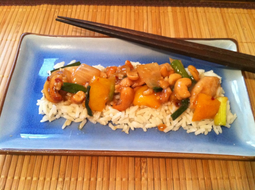 I have to admit, you can probably count on both hands, how many times I’ve had thai food. There is a restaurant near where I live called Phuket (pronounced Poo-ket) Thai that serves a cashew chicken dish that I absolutely adore. So, I thought I’d try my hand in making it, or something similar, at home. I found a recipe online that got rave reviews, but did have me raise an eyebrow when I saw fish & oyster sauces as two of the ingredients. I tweaked it a bit and am thrilled to report that it turned out delicious! As a vegetarian dish, this would be equally scrumptious if tofu was substituted for chicken or you just omitted the poultry and added more vegetables.